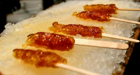 เมเปิ้ลไซรัปไปให้ละลายบนหิมะและจับตัวเป็นแท่ง