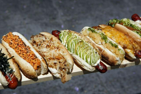 ฮอทดอกสไตล์ญี่ปุ่นที่เอาส่วนผสมแบบญี่ปุ่น เช่น ไก่เทอริยากิหรือโอโคโนมิยากิมารวมกับฮอทดอก