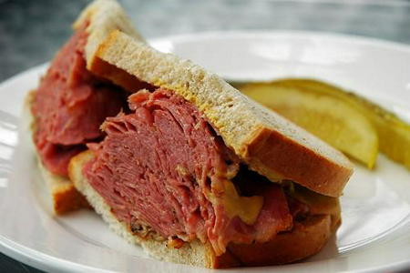 แซนวิชขนมปังเบเกิ้ลยัดไส้เนื้อรมควันจนล้น