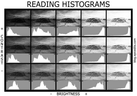 Histogram คือ กราฟแท่งที่แสดงจำนวนของพิกเซลที่กระจายกันอยู่ในค่าความสว่างช่วงต่าง ๆ ที่อยู่ในภาพ โดยด้านซ้ายจะเป็นส่วนที่มืด พวกเงา ส่วนสีดำ, ด้านขวา จะเป็นส่วนที่สว่าง