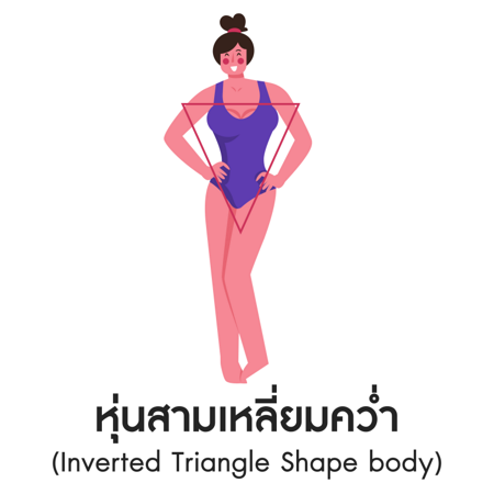 จุดเด่นสัดส่วน : รูปร่างช่วงบนใหญ่ เด่นชัดคือส่วนของหัวไหล่และหน้าอกกว้างกว่าช่วงล่างที่เป็นช่วงของเอวและสะโพก ส่วนของสะโพกจะค่อนข้างเล็กคล้ายหุ่นไหล่กว้างแบบผู้ชาย จุดเด่นของคนกกลุ่มนี้จึงมีไหล่ที่สวย และสามารถใส่เสื้อผ้าที่เน้นช่วงล่างได้สบาย