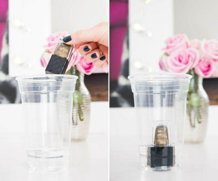 14. ถ้าเปิดฝาขวดน้ำยาทาเล็บไม่ออกก็นำไปจุ่มในถ้วยน้ำอุ่น ต้องดูให้แน่ใจว่าแช่ทั้งขวดด้วยนะ