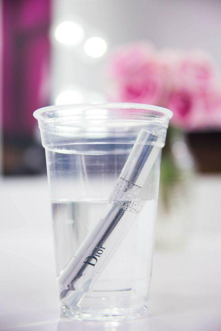 แช่แท่งมาสคาร่าในถ้วยน้ำอุ่นให้เนื้อมาสคาร่าที่ติดอยู่ตามด้านข้างหลุดออกมา