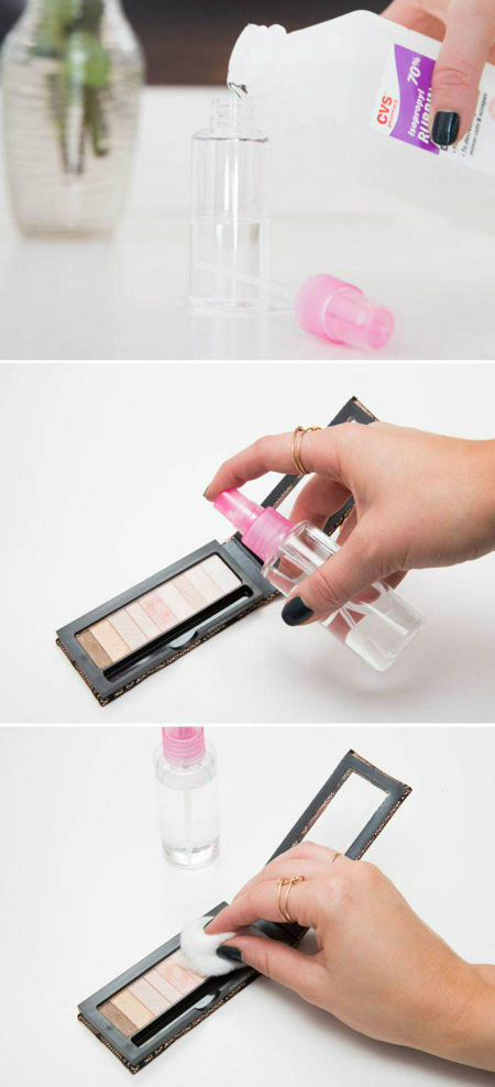 ทำความสะอาดสิ่งสกปรกที่ตกข้างในอายแชโดว์ ด้วยขวดสเปรย์ใส่แอลกอฮอล์ล้างแผล
