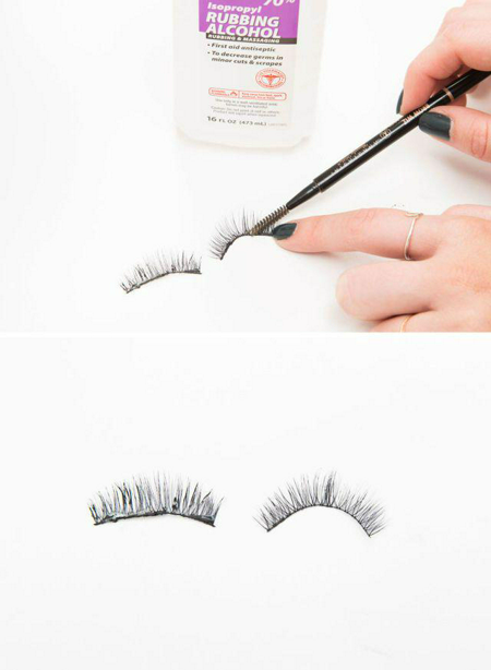 จุ่มแปรงปัดขนตาลงในแอลกอฮอล์ล้างแผลแล้วเอามาเช็ดทำความสะอาดคราบกาวบนขนตาปลอม