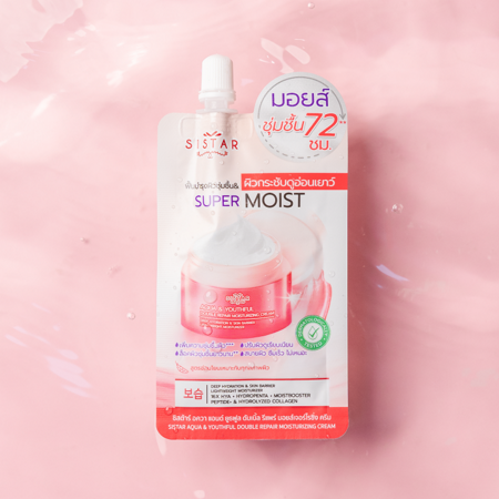 ต่อมาต้องตัวนี้เลย SISTAR Aqua & Youthful Double Repair Moisturizing Cream มอยส์ผิวเฟิร์ม ซองสีชมพูนี่เลยค่ะ สำหรับในช่วงหน้าหนาวอากาศแห้ง พอผิวแห้ง ผิวโทรมอ่อนแอ ก็อาจจะทำให้เกิดริ้วรอยขึ้นได้ หรือใครอยากป้องกันริ้วรอยก่อนวัย มอยส์ตัวนี้ก็สามารถกู้ผิวกระชับขึ้นได้ เพราะน้องตัวนี้เป็นสูตร เติมน้ำให้กับทุกชั้นผิว และยังช่วยบำรุงเรื่องของริ้วรอยลดลง ให้ผิวเฟิร์มกระชับ และเรียบเนียนขึ้น ลดปัญหาผิวอ่อนแอ ลงได้ ด้วยสารบำรุงแบบจุก ๆ ได้แก่