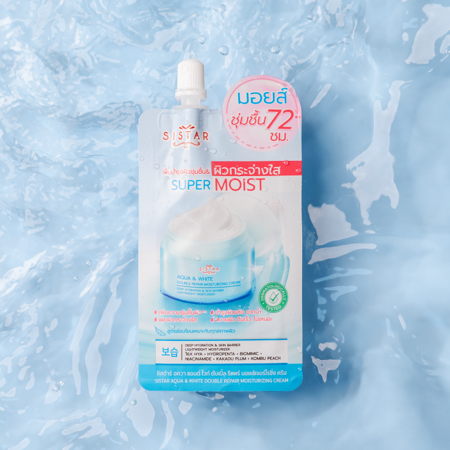 มาเริ่มกันที่ซิสต้าร์ซุปเปอร์มอยส์ตัวแรกกันเลยดีกว่า สำหรับใครที่อยากกู้ผิวช่วงหน้าหนาวอากาศแห้ง พร้อมกับปรับผิวไบร์ท ลดจุดด่างดำไปด้วย สูตร SISTAR Aqua & White Double Repair Moisturizing Cream ซองสีฟ้า สูตรนี้เหมาะกับปัญหาผิวหมองคล้ำ มีจุดด่างดำสุด ๆ เพราะว่ามอยส์กู้ผิวสูตรนี้มีส่วนผสมหลักที่ ช่วยให้ผิวกระจ่างใส ลดจุดด่างดำ อยู่ด้วย ไม่ว่าจะเป็น