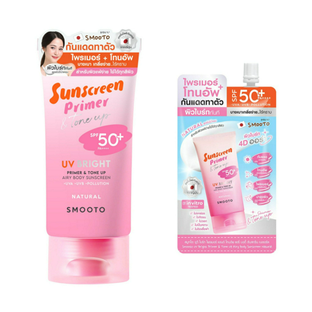 อย่าง Smooto UV Bright Primer & Tone Up Airy Body Sunscreen กันแดดนวัตกรรมผิวไบรท์ 4D ออร่า นอกจากเป็นครีมกันแดด และยังเป็นโทนอัพปรับผิวไบรท์ออร่าด้วย บอกเลยว่า เหมาะสุด ๆ กับลุคไปเดินสยาม ต่อให้แดดแรงแค่ไหนก็ไม่หวั่น เพราะปกป้องแสงแดด รังสี UV แบบ Hybrid sunscreen ด้วย SPF50+ PA++++ ยังไม่พอ แถมยังช่วย โทนอัพผิว เบลอรูขุมขน เรียบเนียน ไม่ตกร่อง สีผิวดูกระจ่างใส สม่ำเสมอ อีกด้วย