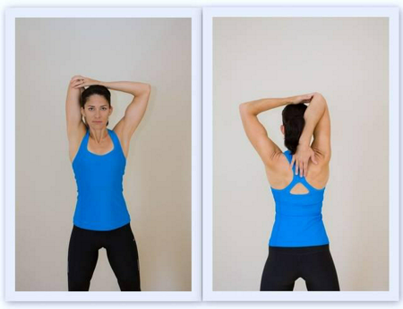 ยืนแยกขาความกว้างประมาณไหล่ ชูมือขวาขึ้นเหนือศรีษะ และงอข้อศอกให้มือขวาพยายามแตะไปที่สะบักหลั