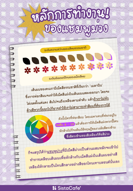 : จากวิจัยค้นคว้าอิสระเรื่องแผนธุรกิจผลิตภัณฑ์แชมพูม่วงสำหรับผมทำสีอ่อนหรือผมกัดสี HYDEE (โดยคุณสุพิชฌาย์ แก้วเปล่งศรีสกุล) บอกเอาไว้ว่า "สีม่วงของแชมพูจะมีความสัมพันธ์กับทฤษฎีสี เนื่องจากเส้นผมของคนเรามีเม็ดสีธรรมชาติที่เรียกว่า 'เมลานิน' ซึ่งการฟอกสีผมจะทำให้เม็ดสีแฝงในเส้นผมแสดงออกมา โดยจะมีเฉดไล่ไปตั้งแต่แดง ส้มไปจนถึงเหลืองตามลำดับ แล้วถ้าเราไม่หักล้างสีพวกนี้ออกไปก็จะทำให้เราไม่สามารถที่จะทำสีผมที่ต้องการได้ ดังนั้นใครที่ฟอกสีผมแล้วต้องการให้เม็ดสีแฝงพวกนี้โดนหักล้างไปก็จะต้องใช้ทฤษฎีของวงล้อสีตรงข้าม ซึ่งสีตรงข้ามของเหลืองก็คือสีม่วง" สรุปง่าย ๆ ก็คือถ้าเราต้องการหักล้างเม็ดสีเหลืองในเส้นผมก็จะต้องใช้สีม่วงในแชมพูม่วงมาช่วยนั่นเองค่ะ แต่ว่านอกจากเม็ดสีม่วงที่เป็นส่วนผสมสำคัญของแชมพูม่วงแล้วก็ยังมีส่วนผสมอื่น ๆ อีกด้วย จะมีอะไรบ้างก็มาดูเพื่อนำไปใช้เลือกกันเล้ย~