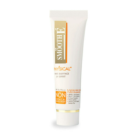มาต่อกันที่ Smooth E Physical White Babyface SPF 50+ PA+++ UV Expert ตัวนี้เป็นครีมกันแดดที่เคลมมาว่า มีความอ่อนโยนต่อผิวบอบบางแพ้ง่าย ผิวเด็ก และสตรีมีครรภ์ ช่วยปกป้องผิวขั้นสุดด้วยสารกันแดด Zinc Oxide และ Titanium Dioxide สะท้อนรังสี UVA และ UVB ทำให้ปลอดภัย ไม่ทิ้งสารเคมีตกค้างบนผิว และยังมีส่วนช่วยคุมมัน พร้อมกับบำรุงไปด้วยในตัว จากส่วนผสม Porous Silica ช่วยดูดซับความมันส่วนเกิน และสารบำรุง Aloe Vera, Rosehip Oil, และ Vitamin E ที่ช่วยลดอาการระคายเคืองและเพิ่มความชุ่มชื้นอยู่ด้วย