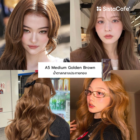 สีนี้คือตรงกลางระหว่างความพอดี ใครที่อยากย้อมผมให้ดูออกว่าย้อมแต่ก็ยังอยากดูเรียบร้อย ก็สามารถย้อมผมโทน Medium Golden Brown เบอร์ A5 ได้เลย เปลี่ยนลุคให้ดูสดใส หน้าดูสว่างขึ้นด้วยประกายทองชัดเจน เหมาะกับคนผิวขาวเหลือง ช่วยเบรกความหมองได้ดีมาก