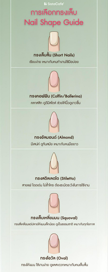 การจะทำเล็บให้ออกมาสวยที่สุด สิ่งสำคัญอย่างหนึ่งคือการเลือกทรงเล็บที่เหมาะสมกับรูปนิ้ว ไลฟ์สไตล์ และการเลือกสีที่เข้ากับอันเดอร์โทนผิว เพื่อช่วยขับผิวให้ผ่องได้ดียิ่งขึ้น