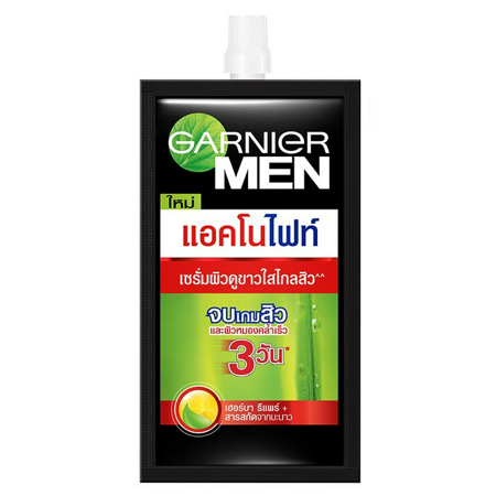 GARNIER | ![]() | เซรั่มครีมแบบซอง เหมาะสำหรับผู้ชายที่มีผิวมันง่ายและมีแนวโน้มเป็นสิวง่าย ช่วยเรื่องสิว ความหมองคล้ำ มี Niacinamide, Salicylic acid ช่วยผลัดเซลล์ผิว ลดเลือนจุดด่างดำ รอยสิว ให้ผิวดูกระจ่างใส | เซรั่ม | ผิวที่มีปัญหาสิว เช่น สิวอุดตัน สิวอักเสบ จุดด่างดำจากสิว และปัญหาผิวหมองคล้ำไม่สม่ำเสมอกัน โดยเฉพาะผิวผู้ชาย | 7 ml | 15 - 30 |