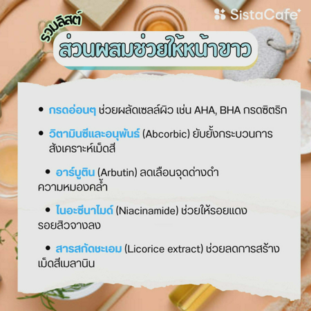 คุณสมบัติ ช่วยให้ผิวกระจ่างใส ลดจุดด่างดำ ลดรอยแดง รอยสิว สีผิวสม่ำเสมอ