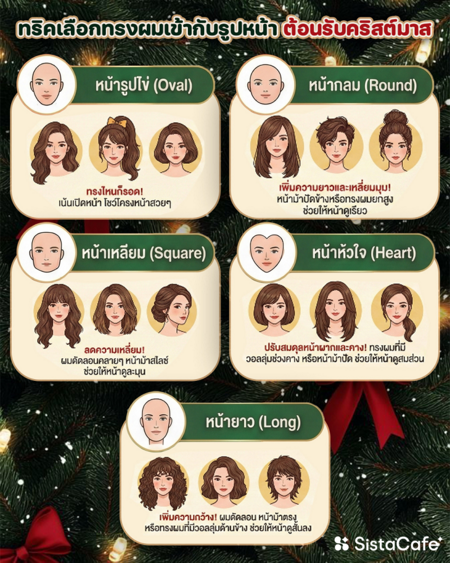 การเลือก ทรงผมคริสต์มาส ให้เข้ากับรูปหน้าเป็นอีกวิธีที่ช่วยให้ลุคออกมาดูลงตัวที่สุด ปี 2025 นี้เน้นลุคธรรมชาติ ไม่จัดแต่งเยอะ แต่ใช้จุดโฟกัสอย่าง Accessory ให้ช่วยบาลานซ์รูปหน้าแทน มาดูกันว่าแต่ละทรงหน้าต้องทำผมทรงไหนบ้าง