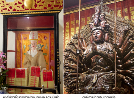 เทพเจ้ากวนอู เทพเจ้าแห่งความแข็งแกร่ง ยึดถือคุณธรรม และความซื่อสัตย์ ทั้งยังเป็นสัญลักษณ์ความมั่งคั่ง องค์กวนอูที่ประดิษฐานที่นี่เป็นปางนั่งสวมชุดลำลอง บางแห่งเรียกว่า ปางสั่งการ หรือ ปางบารมี สื่อถึงความเมตตา ควบคู่ไปกับความยุติธรรมและความเด็ดขาด