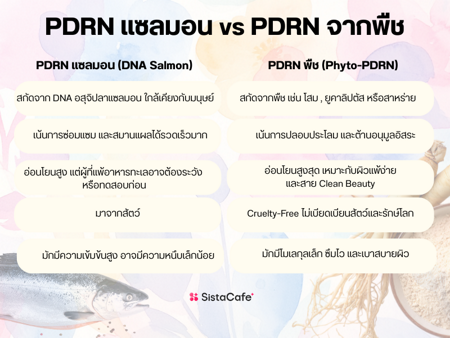 นอกจาก PDRN แบบดั้งเดิมจะมาจากปลาแซลมอนแล้ว ตอนนี้ในแล็บระดับโลก โดยเฉพาะฝั่งเกาหลี เขาก็มีการพัฒนาการสกัด PDRN จากพืชขึ้นมาแทน เพื่อตอบโจทย์ Vegan และคนที่มีความกังวลเรื่องการแพ้สารสกัดจากสัตว์ โดยจะมี "Phyto-PDRN" หรือ PDRN จากพืช ซึ่งส่วนใหญ่มักสกัดมาจาก "โสม" (Ginseng) หรือ "สาหร่ายบางชนิด" ค่ะ มีประสิทธิภาพใกล้เคียงกับ PDRN จากอสุจิปลาแซลมอน แต่จะช่วยลดความเสี่ยงสำหรับคนที่มีอาการแพ้อาหารทะเล หรือกังวลความกังวลเรื่องการปนเปื้อนจากสัตว์น้ำได้ค่ะ