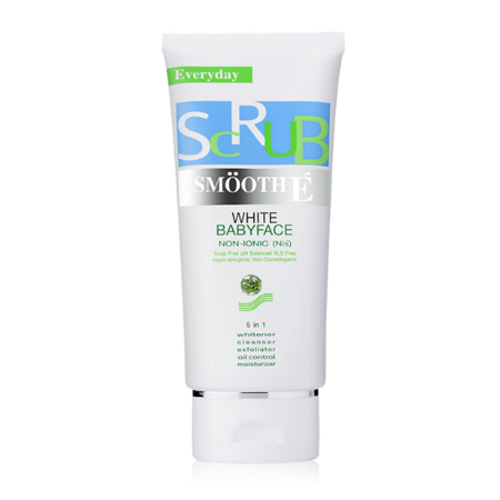 Smooth E White Babyface Scrub สครับไม่มีฟอง สูตร Non-Ionic อ่อนโยน ไม่มีประจุไฟฟ้า ไม่มีสารตกค้าง ความคุมความมัน เม็ดสครับจากเปลือกวอลนัทที่กลมมน ไม่บาดผิว ช่วยลดสิวเสี้ยนได้ดีเยี่ยม พร้อมสารบำรุงผิว และสารช่วยเรื่องความขาว 3 ชนิด ช่วยให้ผิวกระจ่างใสขึ้น พร้อมช่วยดูแลปัญหาแผลเป็นด้วยสารสกัดจากหอมใหญ่ ป้องกันการเกิดแผลเป็นชนิดนูน
