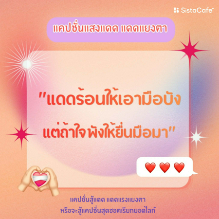มี " แคปชั่นหน้าร้อน " แคปชั่นไหนอ่านแล้วชอบ อยากเอาไปตั้งแคปชั่นรูปของเธอบ้างไหมเอ่ย ? บอกเลยว่า I need vitamin SEA มาก ณ จุดนี้ อากาศสดใสแบบนี้ ให้นั่งจับเจ่าในบ้าน ชีวิตมันก็จะเฉาเกินไปนะคะซิส ไปสูดอากาศบ้าง ต่างจังหวัดหรือต่างประเทศก็ได้ นั่งอาบแดด หรือริมทะเลชิลล์ ๆ ใครสายลุยก็ไปปีนภูเขา เล่นเซิร์ฟบอร์ดนอกจากใช้เวลาให้เป็นประโยชน์แล้ว ยังช่วยเยียวยาจิตใจโดยไม่รู้ตัวด้วยนะ ใครที่กำลังเหงา ป่วยเป็นโรคซึมเศร้า ลองออกมาทำอะไรใหม่ ๆ ควบคู่กับการรักษา ก็น่าจะช่วยให้เธอยิ้มได้บ้างนะคะ ^^