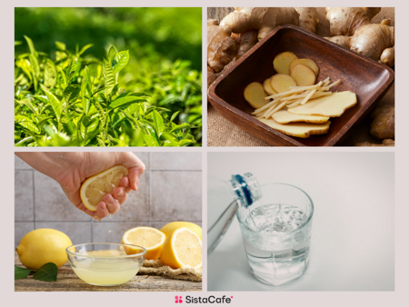 How to : ใส่ขิงฝานลงในแก้ว แล้วเทน้ำร้อนทิ้งไว้ประมาณ 3-5 นาที ตามด้วยซองชาเขียวลงไปแช่ต่ออีก 2-3 นาที รอให้ชามีอุณหภูมิอุ่นลงเล็กน้อยแล้วค่อยบีบมะนาวลงไป