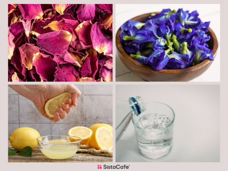 How to : ใส่กุหลาบและอัญชันลงไป เทน้ำร้อนตาม ทิ้งไว้ประมาณ 3-5 นาที หากซิสอยากเปลี่ยนจากน้ำสีน้ำเงิน/ฟ้า ให้เป็น สีม่วงสวยหวาน ลองบีบมะนาวลงไปสักนิดค่ะ