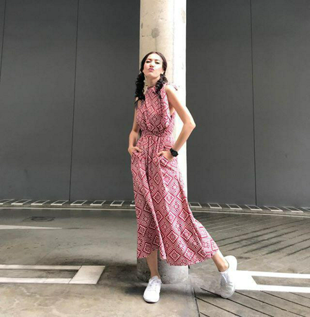 เดรสยาวโทนสีชมพูแขนกุด แมทช์กับรองเท้าผ้าใบขาว
