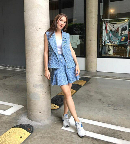 เสื้อกล้ามสีขาว เสื้อกั๊ก กระโปรงสั้นโทนสีฟ้า รองเท้าสนีกเกอร์