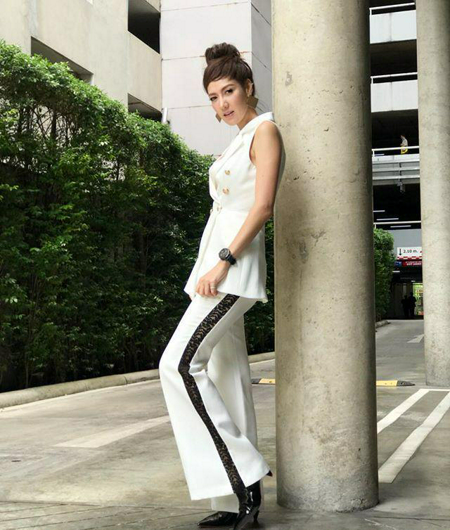ทรงผมเฉียบมาก ผมบัน หน้าม้าซอบปัดข้าง กับแฟชั่นสูทแขนกุดสีขาวสุดปัง