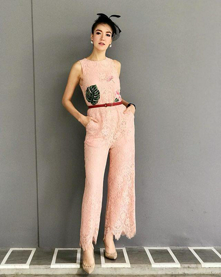 ย้อนยุค สวยหวาน สไตล์ท่านหญิง แฟชั่นจั๊มพ์สูทผ้าลูกไม้โทนสีพีช เข็มขัดสีแดง รองเท้าส้นสูง