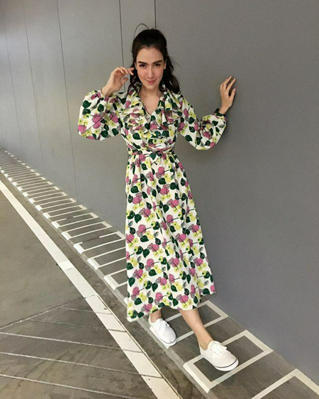 เดรสยาวหวานๆ ลายดอกสวยๆ แมทช์เข้ากับรองเท้าผ้าใบขาว