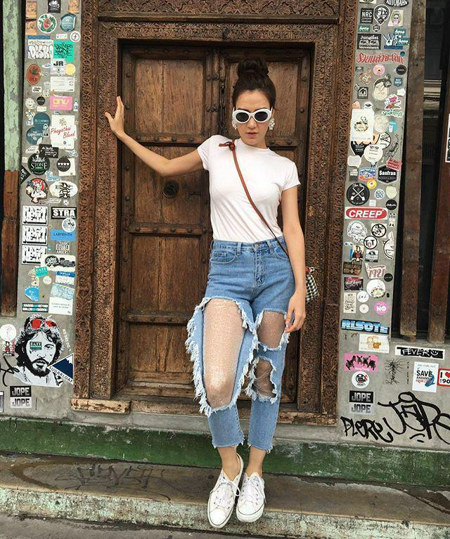 เสื้อยืดสีขาว กางเกงยีนส์ขาสุดปัง รองเท้าผ้าใบขาว กระเป๋าใบเล็กลายตาราง
