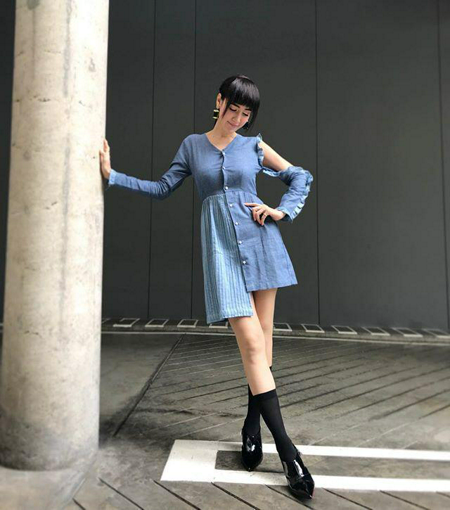เดรสผ้ายีนส์เชิ้ต เว้าช่วงแขนแบบเผ็ชๆ ถุงเท้าสีดำ รองเท้าส้นสูงหนังสีดำเงา