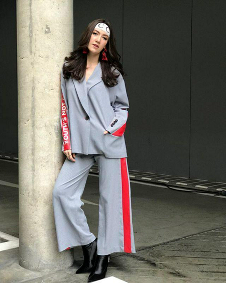 แฟชั่นสูทโอเวอร์ไซส์สีเทา แถบข้างสีดำ รองเท้าบูทสีดำ ที่คาดหน้าผาก มีความสปอร์ต ดูเท่ ดูมั่น เริ่ดค่ะซิส