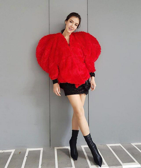 เสื้อขนทรงหัวใจสีแดงดวงโตๆ มิกซ์เข้ากับเดรสสั้นสีดำลายจุด รองเท้าบูทสีดำหนัง