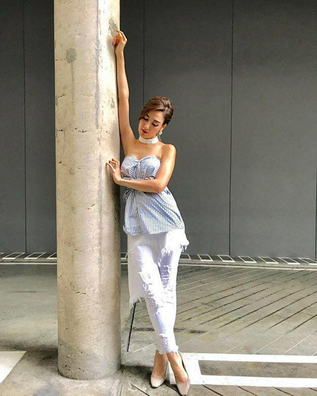 โช้คเกอร์สีขาว เกาะอกลายทางสีฟ้า กางเกงยีนส์ บวกกระโปรงยีนส์สีขาวสุดเฟี้ยว รองเท้าส้นสูง