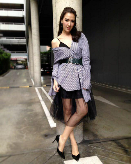 เดรสเชิ้ต ที่มิกซ์เข้ากับซีทรูสีดำ สายเดี่ยวสีดำ ใส่แบบเปิดไหล่หน่อย จะได้ดูเซ็กซี่