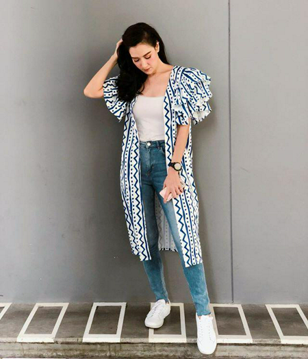 เสื้อกล้ามสีขาว เสื้อคลุมยาวสวยๆ แขนฟูๆ แมทช์กับกางเกงยีนส์ รองเท้าผ้าใบขาว