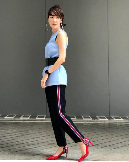 เสื้อแขนกุดสีฟ้า รัดเข็มขัดสีดำใหญ่ที่เอว กางเกงสีดำ แถบข้างสีแดง รองเท้าส้นสูงสีแดง สวยมาก