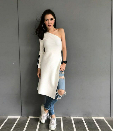 เสื้อชายยาวปาดไหล่โทนสีขาว แมทช์เข้ากับกางเกงยีนส์ขาดๆ รองเท้าผ้าใบขาว