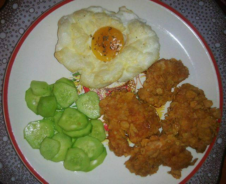 ไข่ดาวก้อนเมฆกินกับแตงกวาและไก่ทอด โรยออริกาโน