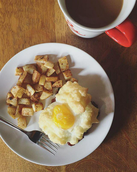ไข่ดาวในก้อนเมฆกินกับขนมปังอบกรอบและกาแฟดำ เมนูคลีนๆ