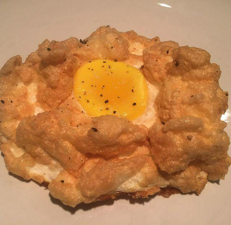 ไข่ดาวในก้อนเมฆโรยด้วยงากับขนมปังปิ้งด้านล่าง
