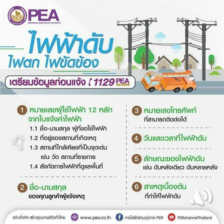 - เบอร์ 1130 แจ้งไปที่การไฟฟ้านครหลวง (กรุงเทพฯ นนทบุรี สมุทรปราการ)