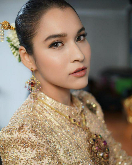 มาในลุคชุดไทย เลือกแต่งตาด้วยโทนสีน้ำตาลทองอ่อน ๆ กรีดอายไลเนอร์เส้นคม ติดขนตาให้ดูยาว แล้วทาลิปสติกโทนสีชมพูนู้ด เป็นธรรมชาติ