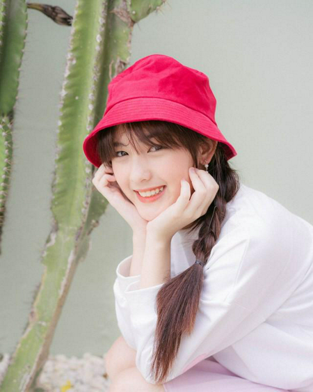 วันไหนออกไปเที่ยว จะเลือกทำทรงผมเปีย พร้อมผมหน้าม้าตรง แล้วใส่หมวก bucket สีแดงสดใสก็ชิค