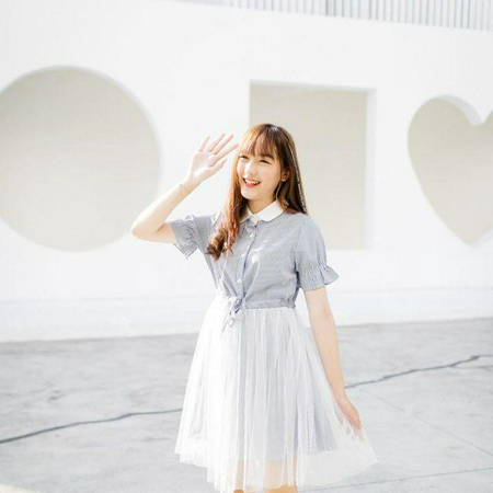 จะเลือกใส่เป็นเดรสเชิ้ตแขนสั้นโทนสีเทา ช่วงกระโปรงเป็นผ้าตาข่ายสีขาวพลิ้ว ๆ ก็น่ารัก ได้ลุคหวาน ๆ แล้ว
