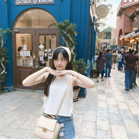 สดใส สไตล์ชิลล์ ๆ แมทช์เสื้อแขนกุดสีขาว กับกางเกงยีนส์ขาสั้น สะพายกระเป๋าใบเล็กสีครีม ก็เข้ากับที่คาดผมสีขาวแล้ว