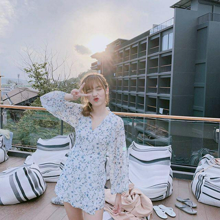 น่ารัก สวยหวาน ด้วยเดรสสั้นแขนยาวสีขาว ลายปริ้นท์ดอกไม้สีฟ้าอ่อน ดูสดใส มีสไตล์ได้ง่าย ๆ