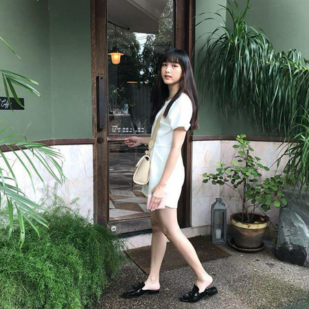 วันชิลล์ ๆ ไปคาเฟ่น่ารัก ๆ ด้วยเดรสสั้นสีขาวแขนสั้น ใส่รองเท้า loafer สีดำ พร้อมกับสะพายกระเป๋าสีครีมเรียบ